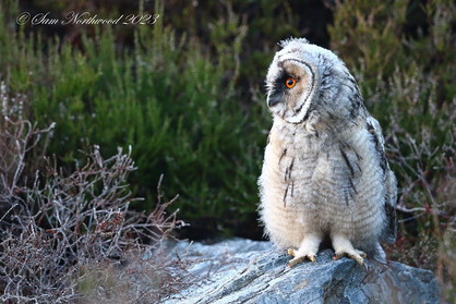 On 11th July I went a little further afield having had a tip-off from a fellow birder, and in the late evening I eventually connected with my first photographable Long-eared Owls. Three fledglings were on show and 'squeaked' for the parents to feed them as they perched openly on branches and fenceposts. This was easily one of my most memorable experiences and one I had been longing for since I dipped a couple of years ago on a similar family of 'LEOs'. (And whilst I waited for the owls to appear, I was entertained by Cuckoos and Stonechats, the latter posing nicely for the camera.)